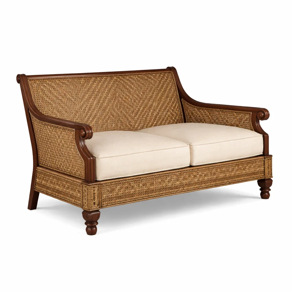 Sofa holz rattan leinenkissen beige