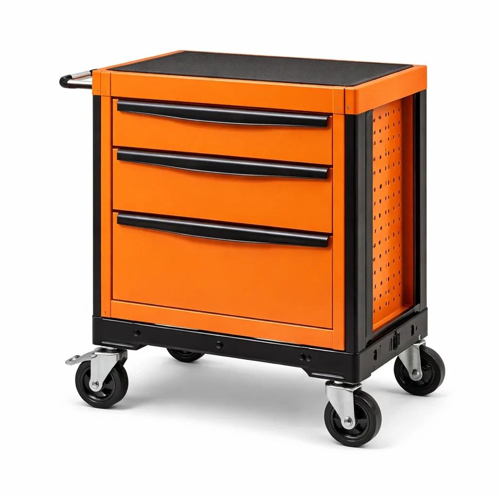 Der Werkstattwagen besteht aus robustem Stahl mit Kunststoffelementen in Orange und Schwarz. Die Abmessungen betragen 68x46x89 cm. Er verfügt über einen stabilen Rahmen mit drei Schubladen, die sicheren Stauraum für Werkzeuge bieten. Die vier Lenkrollen bestehen aus Gummi und sind um 360° drehbar, um einfache Mobilität zu gewährleisten. Die Schubladen sind mit einem Zylinderschloss gesichert.